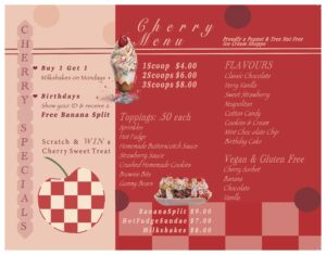 Cherry On Top ~~ The Cherry On Top brochure was inspired by the nostalgic charm of a 1950s ice cream shop. I incorporated red-and-white checkered patterns, bold retro typography, and colourful vector graphics to capture a lively, vintage aesthetic. The design is meant to feel nostalgic and fresh, bringing the spirit of a classic sweet treat to life.